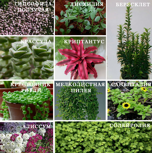 Мини садик в горшке должен дополняться исключительно компактными растения, а в идеале еще и медленнорастущими. Сюда подойдет: