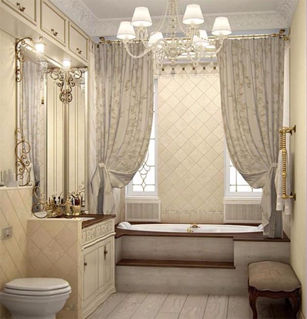 Классика в дизайне — это всегда дорогие и красивые вещи, качественная мебель и дорогая отделка. Люстра для ванной в классическом стиле подбирается соответственно оформлению и фактуры элементов, расположенных в помещении. Металлические элементы в такой люстре должны быть из бронзы, меди или хотя бы стилизованных металлов. Плафоны в виде цветов, лепестков и чаш выполняются из фарфора, керамики, иногда ткани. Прекрасно впишется в классический стиль хрустальная люстра с множеством подвесок.