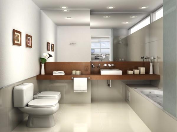 Ванная комната в стиле минимализм — это лаконичность, функциональность и удобство. В данном стиле осветительные приборы также должны быть скромными и неброскими. Отлично подойдут небольшие, встроенные и расположенные по периметру влагостойкие светильнички. Если вам недостаточно света, то на помощь придут споты, которые гармонично впишутся в интерьер.