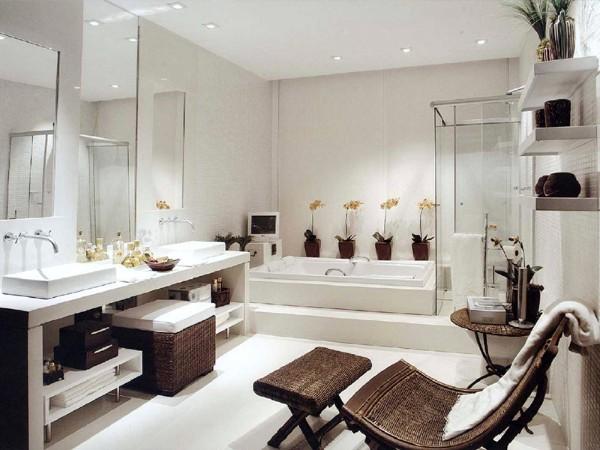 Многие путают стили минимализм и хай-тек, но отличие все-таки есть. Если в ванной в стиле хай-тек вы повесите «лишний ящичек», то совсем не выбьетесь из этого стиля. В этом стиле, освещение стоит выполнить с акцентами на деталях с использованием подсветки.