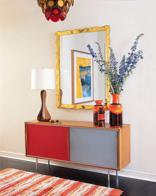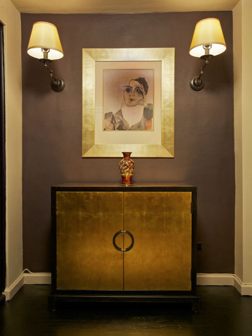 Прихожая в стиле стиляг — целое поле для творчества, пол окрашенный полосами (альтернатива — ковер), однотонные пастельного тона стены с яркими картинами. Пару кресел замысловатых форм и обязательно яркого окраса.