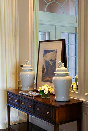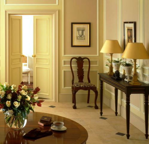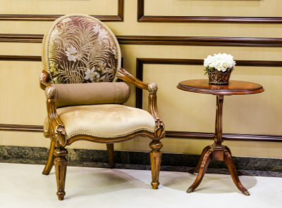 Классический ретро — большие зеркала в позолоченных рамах, напольная ковровая дорожка бордового цвета с золотой тесьмой, диванчик на высоких витиеватых ножках. Кроме того можно установить столик с металлическим кованым основанием и деревянной столешницей, настенные бра с резными элементами и напольные вазы, покрытые узорами.