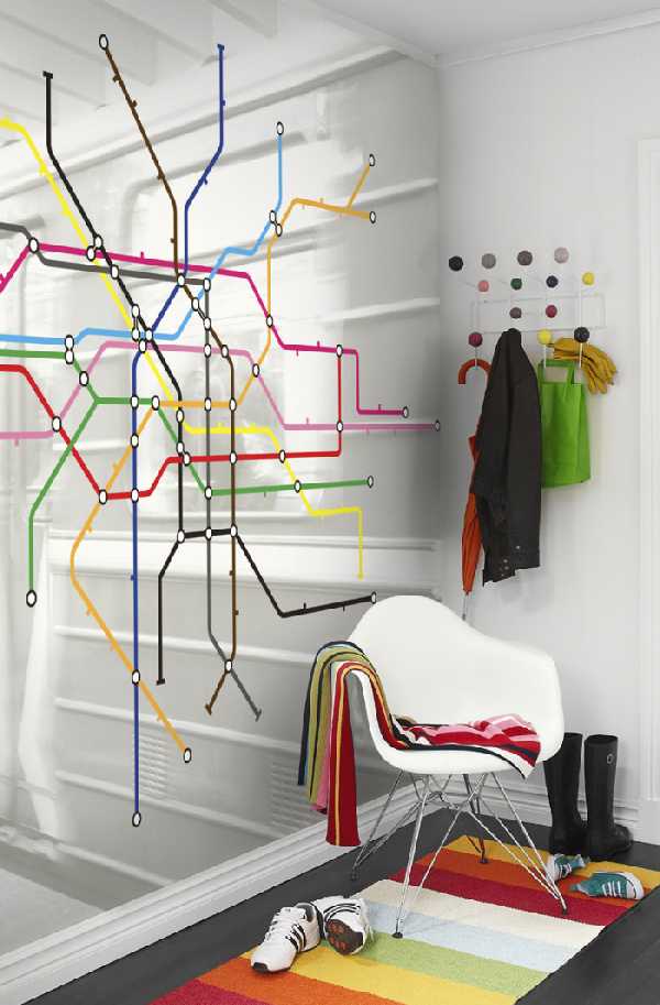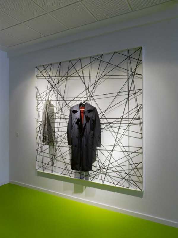 Для воплощения следующей идеи понадобится большая и прочная квадратная рама, деревянная либо металлическая. По периметру металлической конструкции на одинаковом расстоянии нужно приварить крепежные колечки. В деревянной можно просто аккуратно просверлить отверстия. Протяните через них прочную проволоку или веревку контрастного цвета, формируя рисунок, как подскажет фантазия и наша фотография. Получившееся модернистское панно надежно закрепите на стене и позаботьтесь о его освещении. Развесив на натянутых веревках несколько плечиков для одежды, вы получите арт-вешалку для творческой натуры.