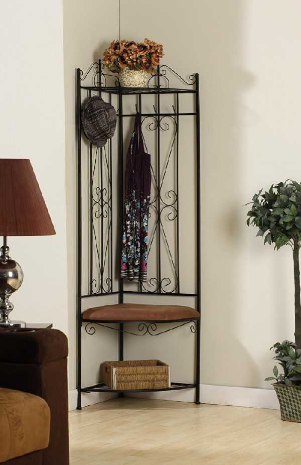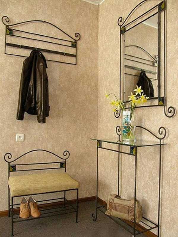 Металлическая кованая мебель — это интересная и стильная находка для маленькой прихожей. Изящная и сквозная, она как будто состоит из воздуха и создает иллюзию свободного пространства, не перегружая его.