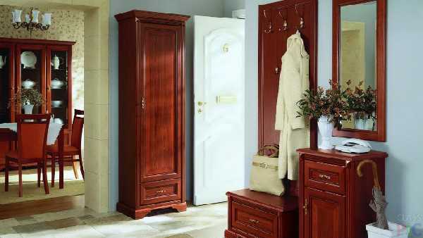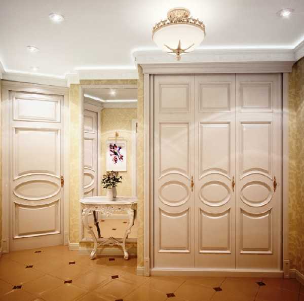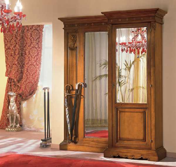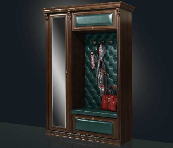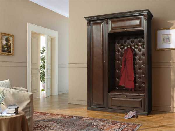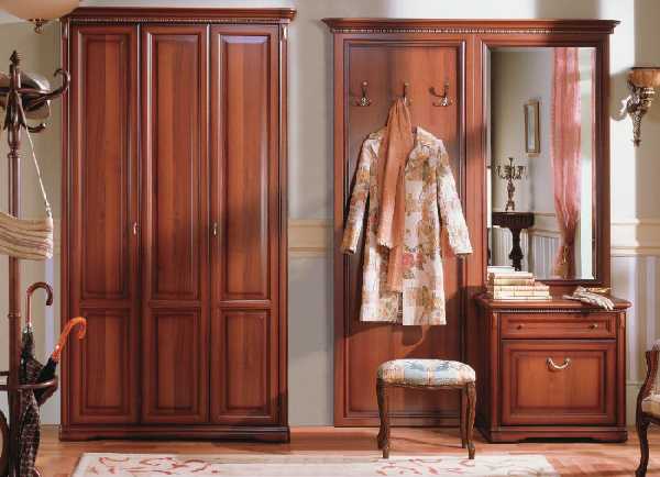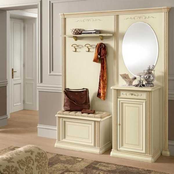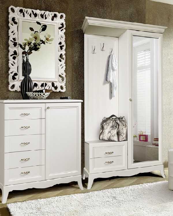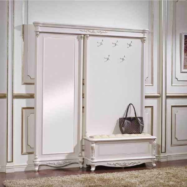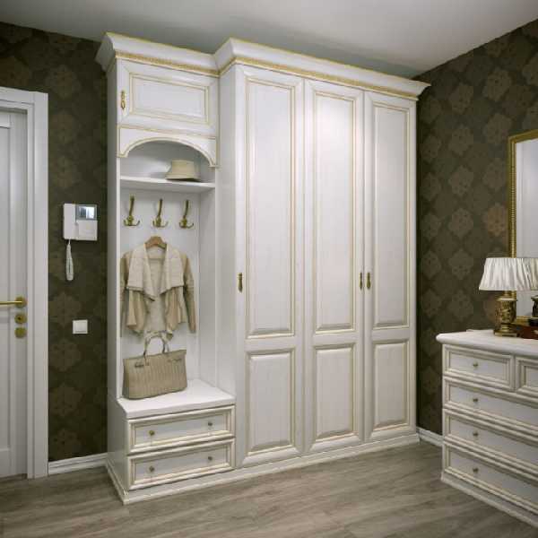 Классические прихожие в коридор выглядят респектабельно и элегантно. Мебель в классическом стиле выдержана в традициях прошлого. Ее линии чисты и изящны. Обязательно используется декор: фигурное обрамление дверных филенок, карнизы, элементы резьбы и т. п. Самые популярные цвета — белый (при этом резной декор может быть позолочен) либо цвет темного дерева. Фигурные мебельные ручки и крючки для одежды непременно должны быть «под старину». Для мягких элементов используется стеганая кожа или дорогой гобеленовый текстиль.
