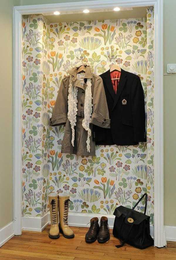 Для обустройства в коридоре прихожей своими руками отлично подойдет небольшая ниша. Эта маленькая площадь таит в себе огромный потенциал для творчества. Там можно прибить крючки для одежды или закрепить штангу, на которой развесить плечики; обустроить полки или скамью для сидения и даже оборудовать место для хранения обуви. Все зависит от ваших умений и фантазии! Зону такой прихожей можно выделить локальной подсветкой и цветом стен. Интересно будут смотреться устойчивые к истиранию обои с красивым растительным принтом.