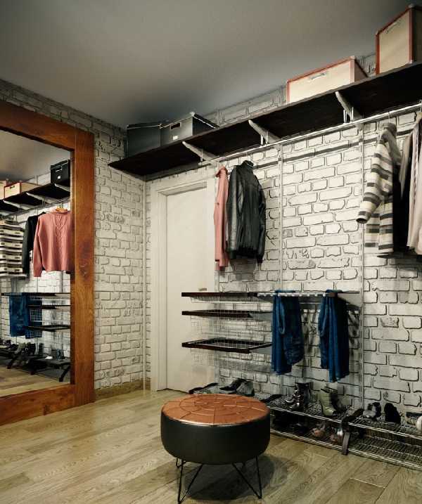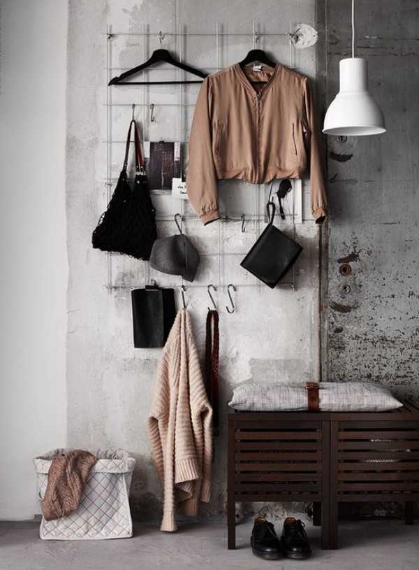 Закрепите на стене прочную металлическую сетку с крупными ячейками, развесьте на ней двухсторонние крюки для одежды и аксессуаров. Дополните картину небольшой тумбой для обуви, и ваша прихожая в стиле лофт готова!