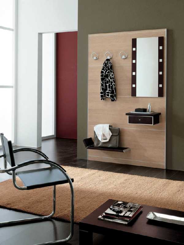 В интерьер маленького коридора отлично вписываются настенные прихожие в минималистическом стиле, состоящие из вешалки, зеркала и других компактных подвесных элементов. Поскольку мебель не соприкасается с полом, она как бы парит в воздухе, за счет чего маленькое помещение кажется более просторным, а интерьер выглядит легким и футуристичным.