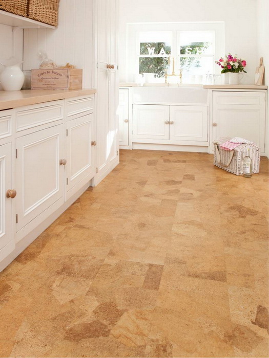Вопреки мнению большинства, пробка не боится влаги и такой пол можно стелить как в кухне, так и в ванной. Для большей уверенности желательно использовать водостойкую основу.
