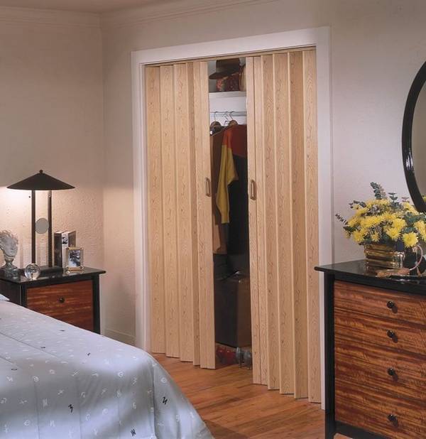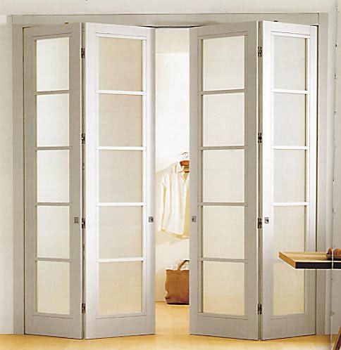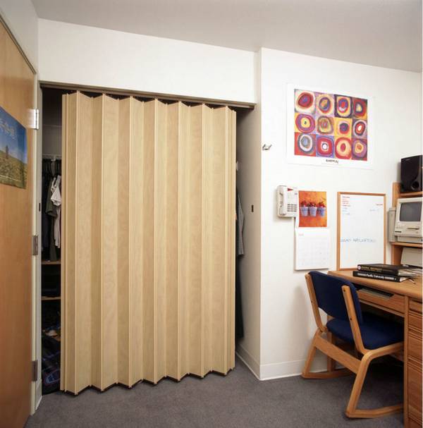 Это весьма оригинальный вариант дверей, требующий немного больше места. Такие двери при открывании складываются, что схоже по принципу работы с обычной ширмой.