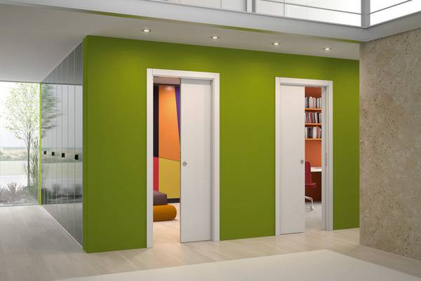 Это наиболее компактный вариант раздвижных дверей, особенностью которого является то, что открывающиеся двери заходят в специальную нишу в стене, полностью скрываясь внутри неё. Этот вариант раздвижных дверей подойдёт для любого помещения, но наиболее уместно будет смотреться в маленьком помещении, где нужно сэкономить место.