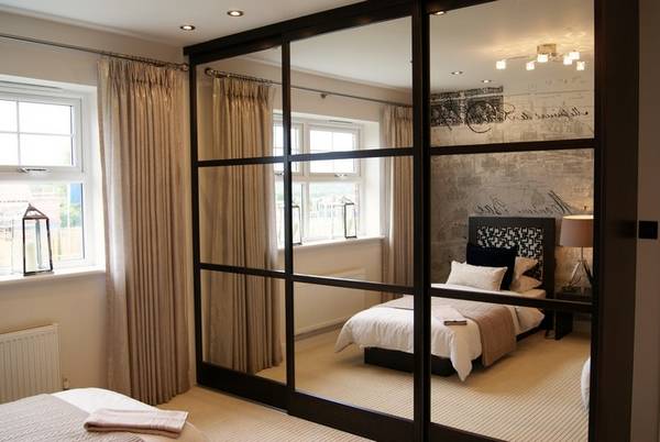 Двери из специального закалённого стекла или зеркала подходят практически под любой интерьер, поэтому являются весьма популярными. Раздвижные зеркальные двери для гардеробной будут оптимальным выбором для небольших помещений, поскольку визуально расширят пространство. Что касается декора, то на стеклянные или зеркальные панели он наносится с помощью пескоструйной обработки, ультрафиолетовой печати или при помощи виниловой плёнки. Посмотреть на оригинальные экземпляры стеклянных и зеркальных дверей в гардеробную раздвижных на фото можно в этой статье.