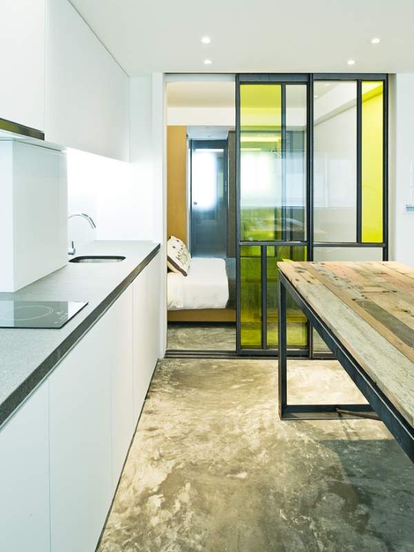 Работа над интерьером кухни должна начинаться только после реконструкции стены, так как необходимым условием для установки раздвижных дверей является наличие скрытого паза. Впрочем, популярным вариантом сегодня является установка открытой системы. Так двери не только экономят пространство, но и украшают его. На следующих фото Dekorin подобрал для вас необычные решения, каким может быть дизайн кухни с раздвижными дверями.