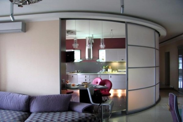 Такие конструкции являются, пожалуй, самым необычным и виртуозным решением для разделения маленькой квартиры на зоны. Радиусные раздвижные двери между кухней и гостиной устанавливают, чтобы добавить в помещение некую изюминку и показать свой непревзойденный вкус. Наилучшим образом будет смотреться вариант, при котором дизайн кухни перекликается с радиусной дверью по цвету или материалам, ведь в таком случае будет чувствоваться единство стиля. Хотя, если ваша кухня выполнена преимущественно в серых тонах, вы можете использовать яркие двери как акцентирующий элемент, который оживит обстановку. На последних фото в этой статье оцените радиусные раздвижные двери на кухню и обязательно поделитесь своим мнением в комментариях!