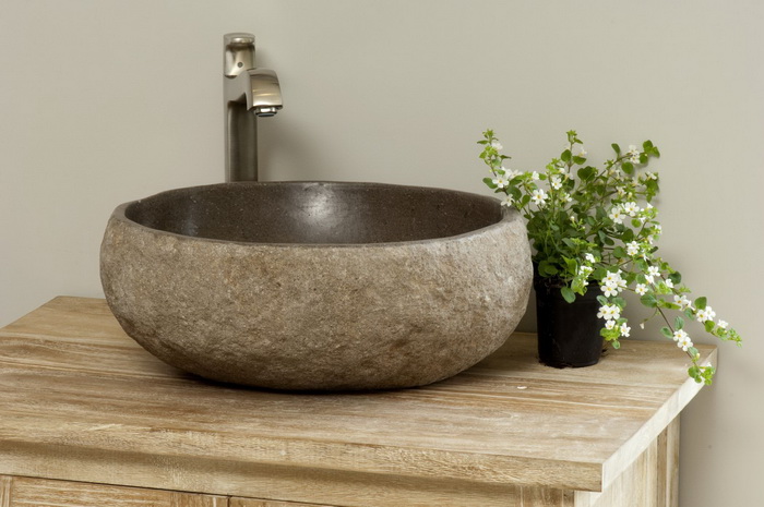Натуральный природный камень один из современных материалов, который активно используют дизайнеры в последнее время. Из камня могут быть подоконники, столешницы, мойки и раковины, стены, наконец. Натуральный камень – материал дорогой, экологичный, прочный, легко принимает температуру окружающей среды, иногда антибактериальный, как мрамор, безумно красивый, уникальный, рисунок и узор неповторимы. Раковина из цельного валуна или куска мрамора в ванной являются стильным и ярким элементом для ванной.