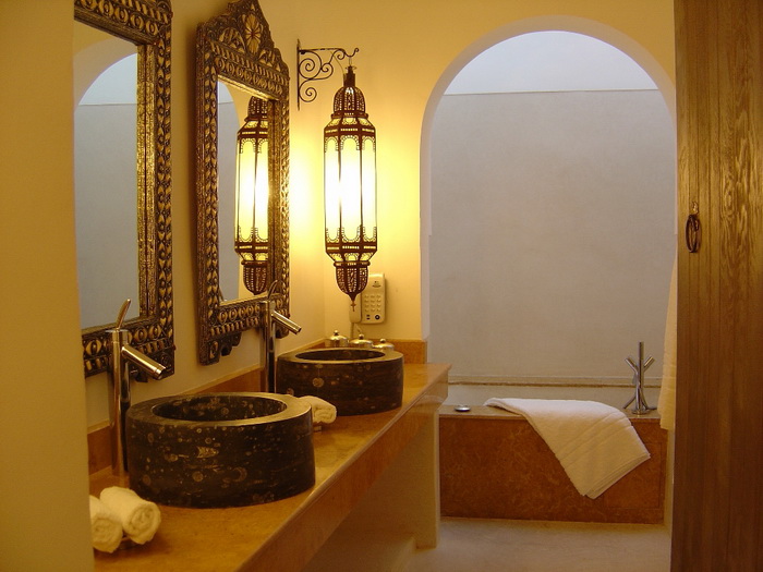 Круглые раковины из чёрного мрамора, зеркала в ажурных кованых рамах, фонарик в замысловатом кованом обрамлении, песочные стены – уютная ванная в восточном, марокканском стиле.