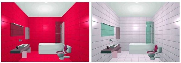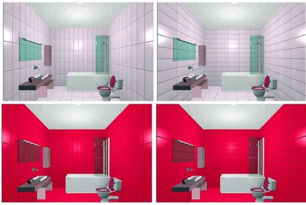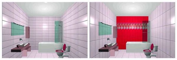 При необходимости сделать потолок визуально выше, при вертикальной раскладке можно на одной из стен (желательно напротив входа) выложить полосу из более светлой плитки. Даже при условии яркой или темной плитки и затирки в тон, потолок «приподнимется». Если же на этой стене использовать кафель более светлого тона, да еще с контрастной затиркой и вертикальной полосой из плитки с орнаментом, эффект будет еще более явным (на рисунке внизу справа).