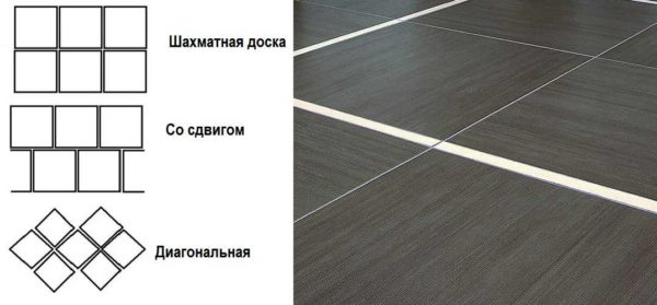 При использовании квадратной плитки обычно укладывают ее в виде шахматной доски (схема шашки), может быть использован способ со смещением на 1/2 плитки. Есть два направления укладки — параллельно стенам и по диагонали.
