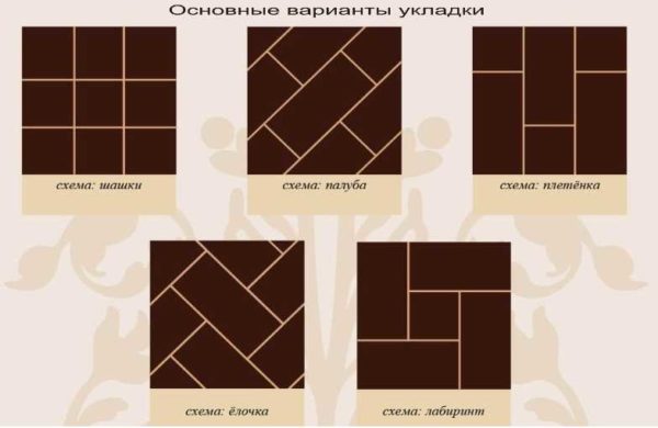 Если выбрана прямоугольная плитка, вариантов раскладки больше — со смещением (палуба, плетенка, елочка). Есть также варианты для комбинации прямоугольной и квадратной плитки — лабиринт, если способы с использованием фрагментов разного размера.