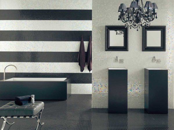 Чтобы расширить помещение или поднять потолок, при подборе раскладки делают вертикальные или горизонтальные «направляющие». Это полосы из кафеля другого цвета, по которым скользит взгляд. Эти полосы изменяют зрительное восприятие размеров помещения.
