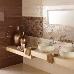 - Интересный вариант – плавное изменение цвета плитки от темного к светлому от низа до верха. При этом средняя линия перехода должна находиться чуть выше раковины.