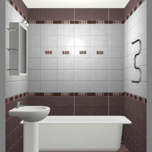 - Смена оттенков темный – светлый – темный, разделяемых бордюрами, подойдет для ванной с высокими потолками.