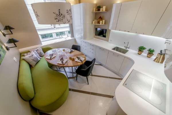 Фигурный раскладной диван на кухню выглядит очень стильно и современно.