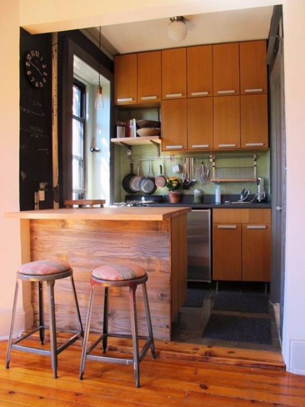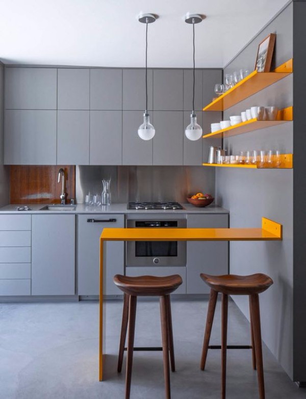 Обеденный стол на кухне — это хорошо, но никогда не стоит ради его больших размеров жертвовать рабочей зоной кухни. Наоборот, лучше выбрать стол небольшого размера или же вовсе установить барную стойку. Это очень удобно и не занимает много места, а при желании на ней можно разместить все необходимое.