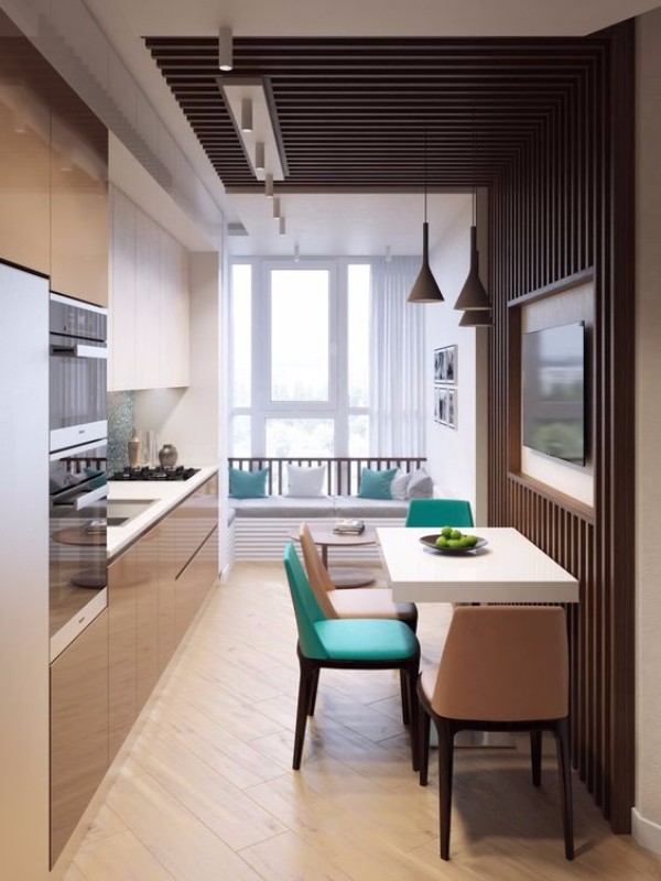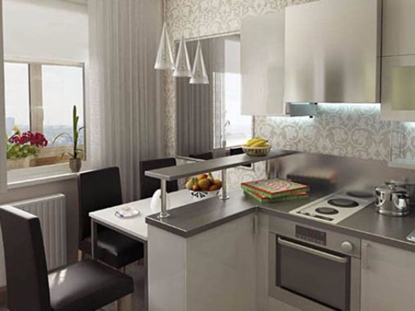 Стены и мебель должны быть преимущественно светлых тонов, ведь это сделает небольшую кухню более светлой и просторной. Если же у вас на кухне есть балкон, можно объединить его с кухней, поставив на его территории обеденный стол. Естественно в таком случае балкон придется утеплить.