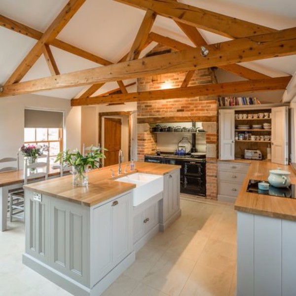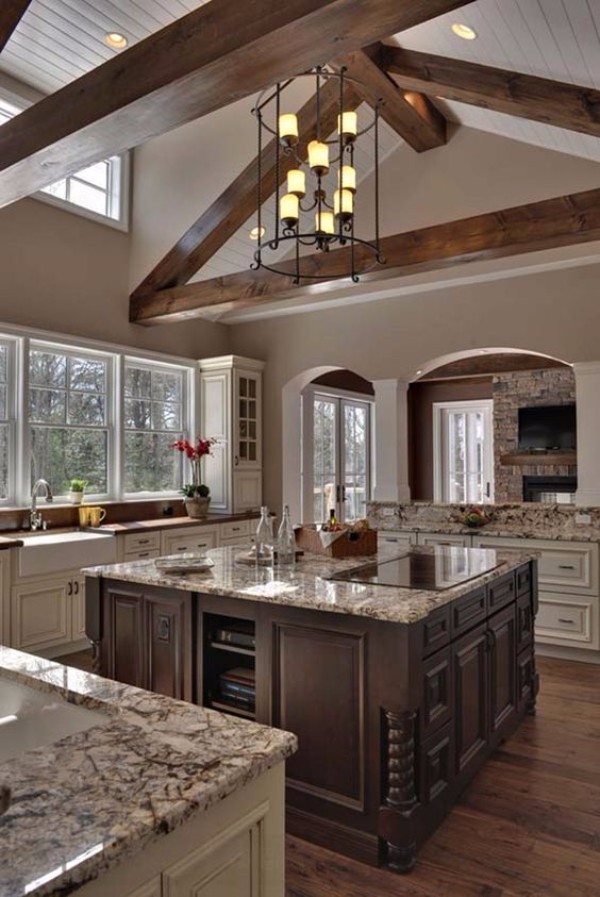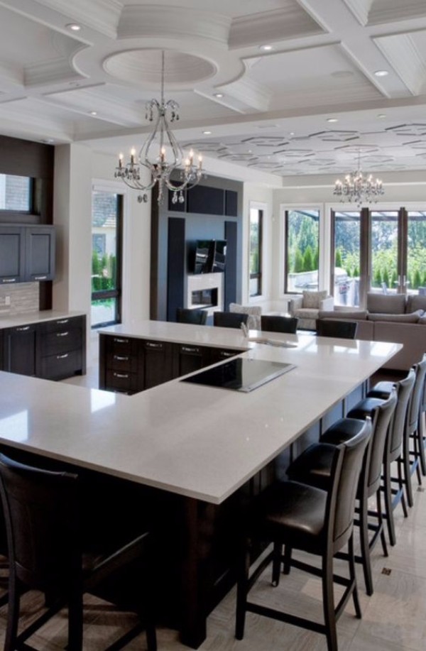 Если же вы обладатель большой кухни в частном доме — у вас есть замечательная возможность разместить все необходимое и оставить максимум свободного пространства. Важно лишь правильно расположить мебель, чтобы хозяйке было легко готовить еду и кухонные хлопоты не отнимали много времени. Так, к примеру на просторной кухне можно сделать П-образную планировку, благодаря которой останется много свободного места, что всегда хорошо. Отличной идеей будет установка острова на такой кухне. На данном острове при желании можно расположить мойку, плиту и другую необходимую технику. На особенно больших кухнях иногда устанавливают не один, а целых два острова, что очень удобно для большой семьи.