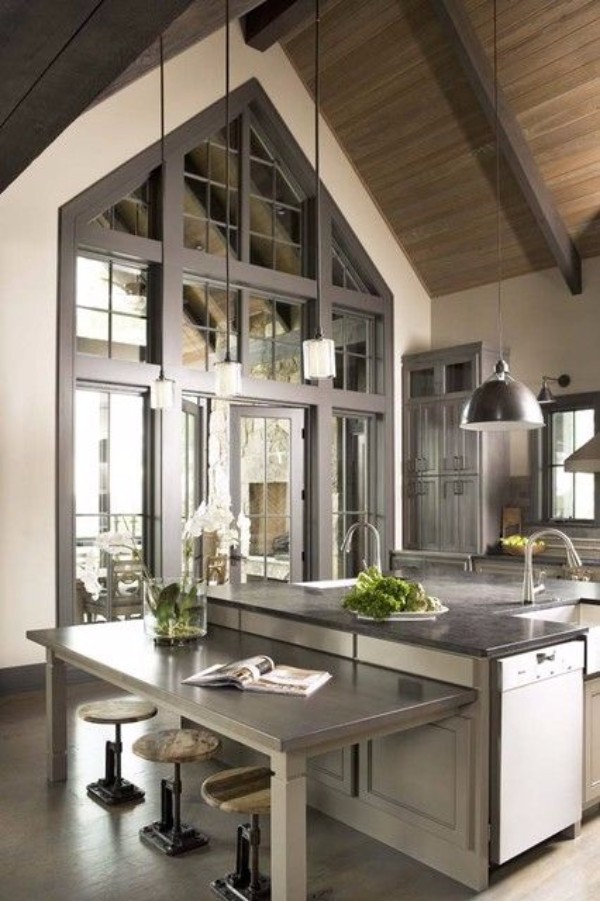Кухня в частном доме хороша тем, что можно установить огромное окно на всю стену, которое станет главным украшением интерьера. Это выглядит весьма необычно и позволяет любоваться видом из окна во время приготовления и приема пищи.