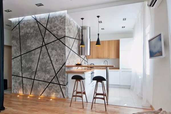 В том случае, если у вас квартира студия, ремонт кухни своими руками — это наиболее оптимальный и недорогой вариант. Особенностью такой кухни является отсутствие перегородки от гостиной комнаты, что визуально увеличивает пространство кухни. Это очень удобно, ведь свободное пространство всегда можно использовать с пользой.
