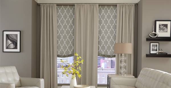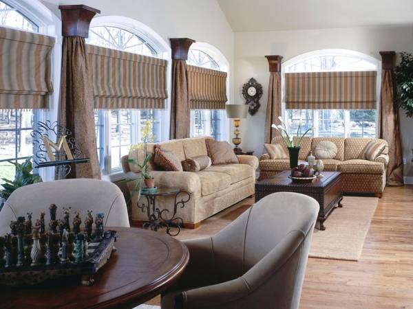 Если в спальне важную роль играет цвет и прозрачность оконных штор, то в зале на первый план выходит красота дизайна. Если вы не знаете, какие римские шторы вам лучше выбрать, то последуйте самому простому принципу подбора и не ошибетесь. Так, если дизайн гостиной выглядит однотонным (в частности стены и мягкая мебель), то выбирайте римские шторы с ярким узором, и наоборот.