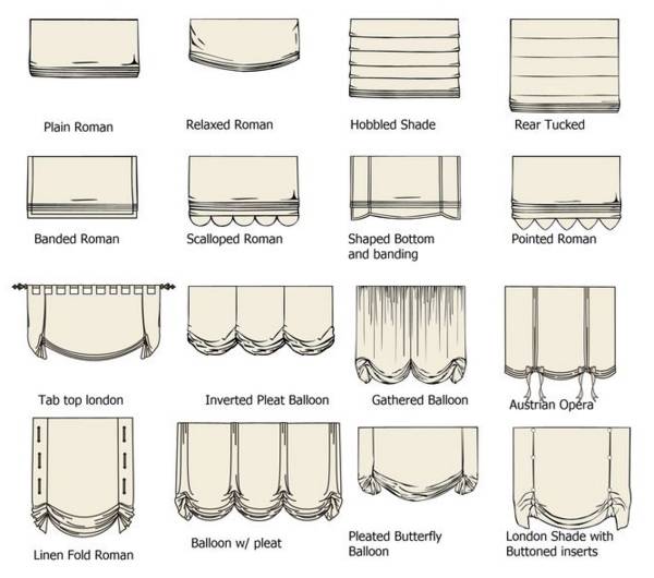 Довольно часто римскими шторами обобщенно называют все виды коротких оконных штор, которые могут не только иметь вшитые планки, но собираться с помощью вертикальных лент, подкалываться клипсами и иными способами. Следующее изображение поможет вам разобраться в разных видах римских и других штор (римские шторы подписаны как «Roman»):