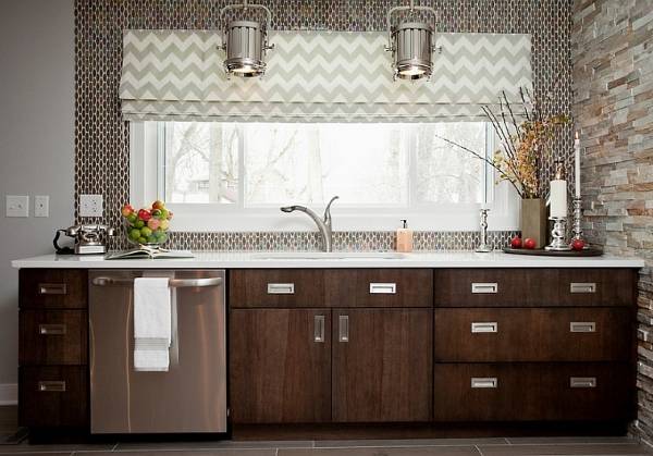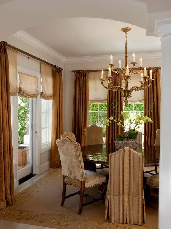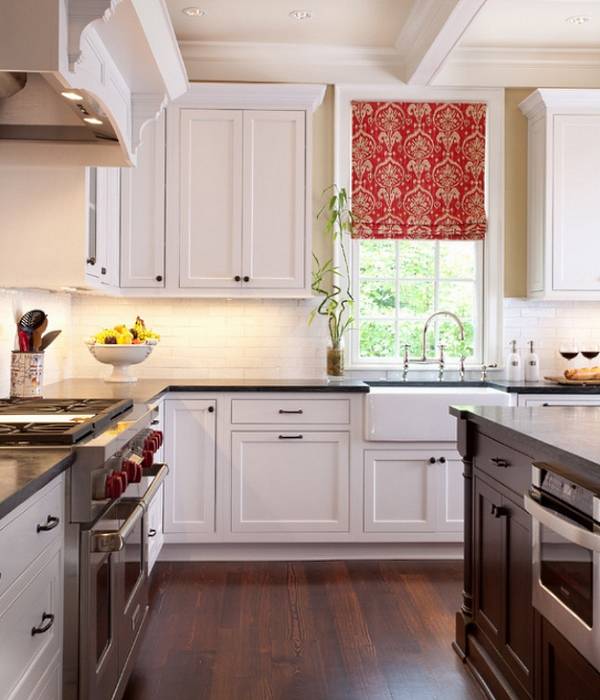 Поскольку большинство кухонь имеют маленькие размеры и большое количество рабочих поверхностей, короткие римские шторы идеально подойдут для этого помещения, и не потребуют усиленного ухода. Просто не забывайте подымать их, когда готовите еду или занимаетесь другим марким делом поблизости!