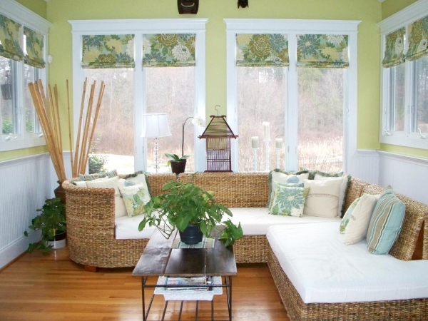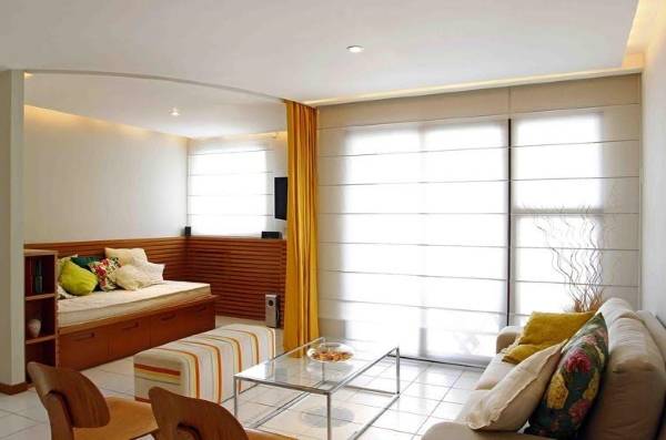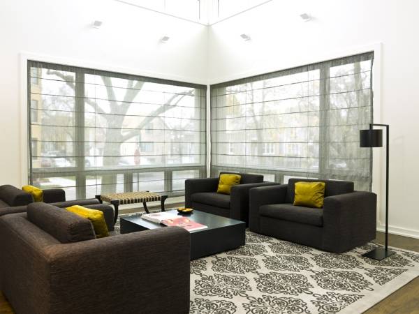 Для тех, кто имеет огромные окна или выход из гостиной на балкон, прекрасным выбором могут стать легкие, полупрозрачные римские шторы, как на следующих фото:
