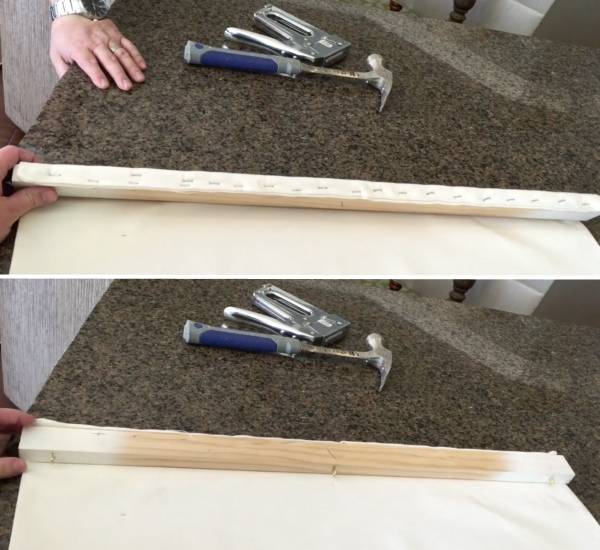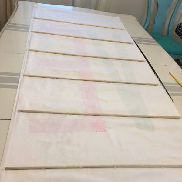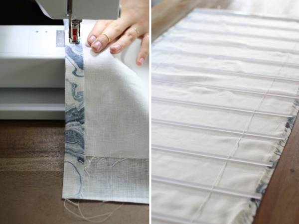 4. Из старых жалюзи убираем лишние планки. Оставшиеся приклеиваем к ткани с изнаночной стороны, как это показано на рисунках.