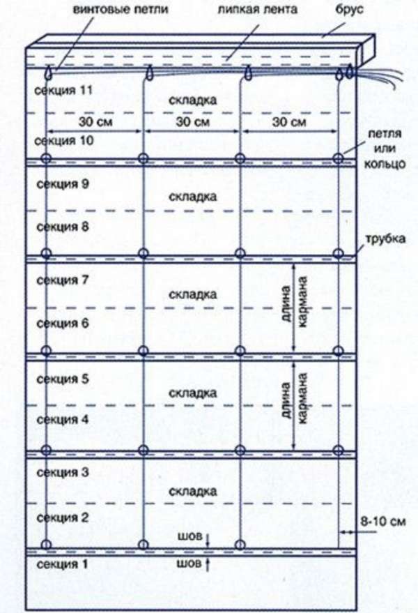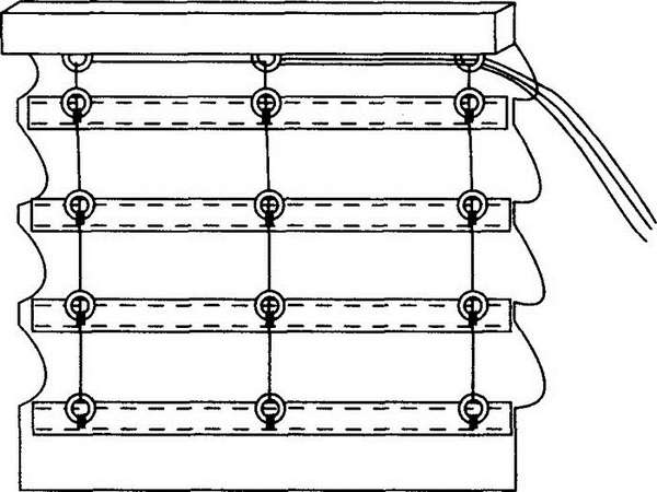 Следующим этапом, изготовление римских штор своими руками предусматривает формирование каркаса с рейками и утяжелителем. Заготовку необходимо разложить на ровной поверхности тыльной стороной к себе. Мелом расчерчиваем линии, где будут вставки с рейками, делаем соответствующие швы, а затем, по ним пришиваем полоски из шторной тесьмы. Вставляем в ячейки прутья из пластика, дерева или металла диаметром не более 5 мм. Далее формируем нижний карманчик и укладываем в него утяжеляющую конструкцию планку, более короткую по длине на несколько сантиметров, чем карниз (это может быть деревянная планка или алюминиевый профиль). Для того, чтобы римские шторы своими руками прикрепить к самодельному карнизу, необходимо к верхней части пришить одну часть липкой ленты. Нижнюю часть можно сделать в разных стилях с добавлением бахромы, кружев, кистей или канта.