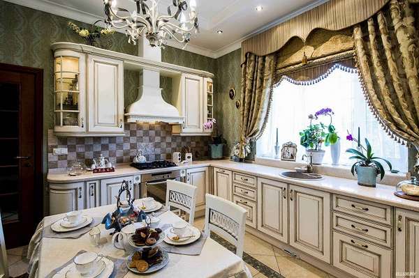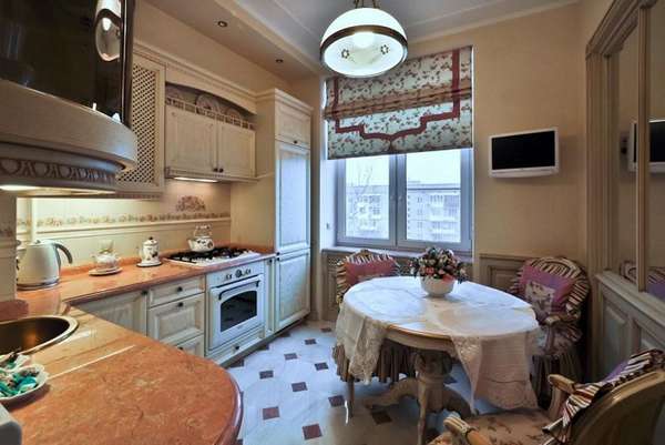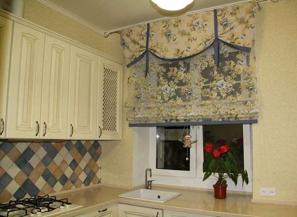 Римская штора на кухню своими руками в классическом стиле может быть выполнена из тканей пастельных тонов, иметь небольшие узоры или кант. Очень выгодно они будут смотреться в сопровождении воздушного тюля или портьер. Также здесь вполне уместны будут бескаркасные римские шторы своими руками.