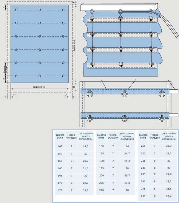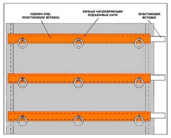 Если Вы хотите видеть у себя на кухне именно такой вариант, с плавными изгибами, пошив римской шторы своими руками несколько упростится — не будет необходимости в оформлении кулисок для планок каркаса. Главное сделать правильно разметку для колец, которые являются частью подъемного механизма. Их должно быть по три штуки — одно в центре и два по бокам на каждом уровне предполагаемого горизонтального сгиба. Через них, в дальнейшем, будут протягиваться нейлоновые шнурки, поднимающие завесу.