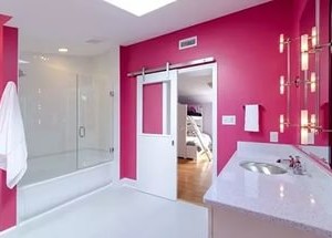 Розовая ванная оформлена белой плиткой и покрашенными в розово-малиновый стенами