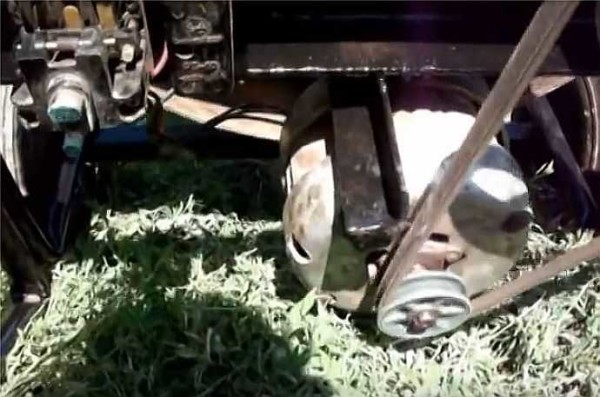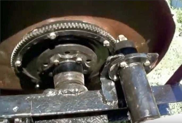 Автомобильный диск прикрепили болтами к днищу (с резиновыми прокладками). Его подбирали так, чтобы образовалась выемка для ременной передачи. К диску предварительно прикрепили ступицу.