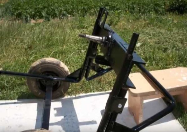Крепим колеса от тележки. Они с широкими протекторами и себя оправдали: перетаскивать бетономешалку несложно даже просто по участку.