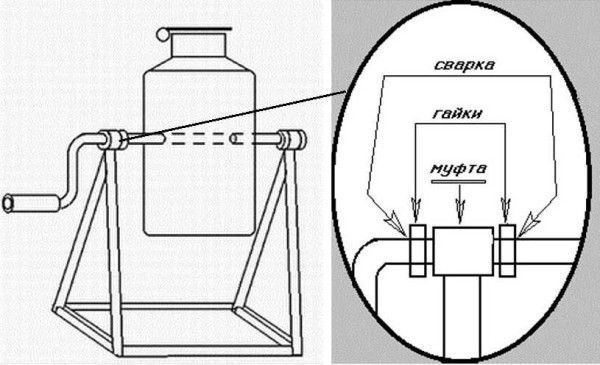 Изготавливаете станину, из круглой трубы выгибаете ручку. В верхней части станины привариваете две водопроводные муфты (например). Их внутренний диаметр чуть больше диаметра трубы, используемой для ручки. Трубу пропускают через флягу, приваривают к корпусу.