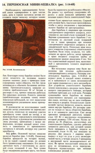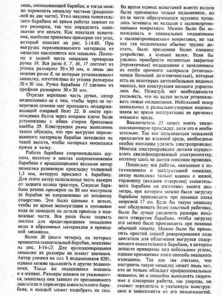 Данная конструкция прослужила у автора 10 лет, хотя была сделана для разовой работы, но оказалась очень удачной: за 20-30 оборотов хорошо перемешивается 2,5 ведра раствора. За это время ее повторили и усовершенствовали соседи и знакомые. В основном переделки касались люка. Экспериментальным путем выявлена самая удачная его конструкция — похожая на ту, Которая используется в молочной фляге. Такую «горловину» приваривают к телу бочки с одной из сторон (смотрите на фото вверху). Также делают ручки с двух сторон — для возможности работы вдвоем.