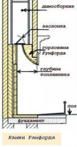 Одна из разновидностей классического называется камином Рамфода (Румфорда). Принцип работы тот же, только обеспечивает завихрение не дымовой зуб, а зауженная горловина дымохода, форма которой повторяет одну из ветвей гиперболы.