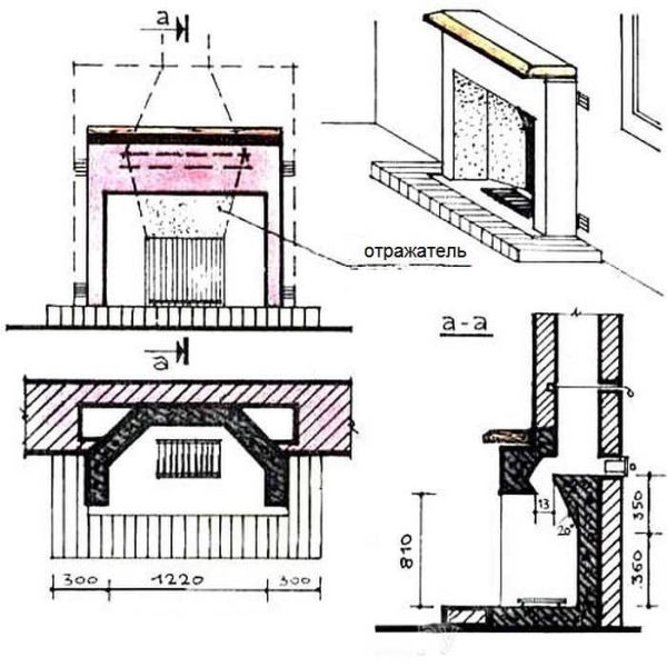 Этот отопительный прибор хоть и имеет традиционную для каминов широкоформатную топку, по сути является печью — у него многооборотный дымоход. Так что это — тяжелое, трудное в исполнении массивное сооружение. У него только два ключевых отличия от печи — размер портала топки и отсутствие поддувала. Если вы знаете, как сложить печь голландку, внеся несложные коррективы, вы сможете ее превратить в камин. Более того, если в доме стоит старая голландка, даже требующая капитального ремонта, она легко превращается в камин. Требуется только разобрать переднюю топочную часть, вставить подходящего размера готовую металлическую топку, подключив ее к дымооборотам и задекорировать.