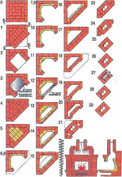 Приведенная выше раскладка — один из видов классического камина для установки его в углу. Схема достаточно проста, но в ней большое количество кирпичей требует подрезки. Для кладки этого кирпичного камина вам точно понадобиться хорошая болгарка и большое количество дисков по камню.
