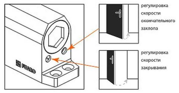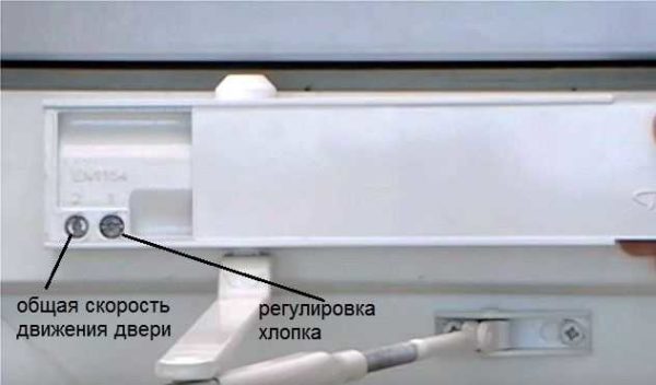 Регулировки скорости открывания двери и «прихлопывания» находятся на корпусе. Чаще всего они или на лицевой части под защитной крышкой или на боковой его поверхности.