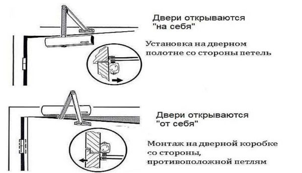 Оба эти типа состоят из двух частей: корпуса, в котором спрятана пружина и передающий усилие механизм и рычаг. Монтируются они вверху двери: одна часть на полотно, вторая — на коробку. Какая-куда, зависит от направления открывания. Если двери открываются «на себя», на дверное полотно устанавливается корпус с механизмом, при открывании «от себя» — крепится рычаг. На фото изображен доводчик рычажного тип, но аналогичные правила установки и для моделей со скользящим каналом.